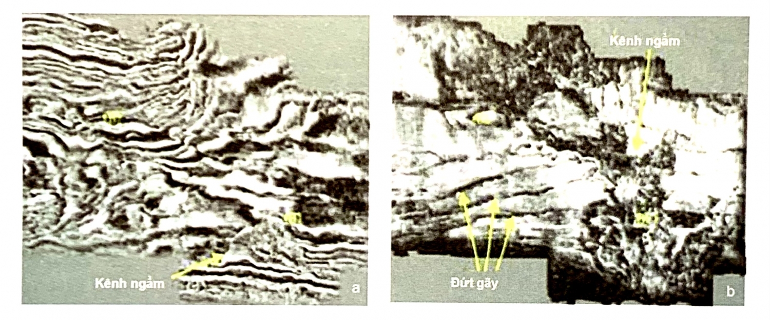 Hình 5.26 - Hình ảnh thuộc tỉnh tách phổ liên quan đến kênh ngầm và đứt gãy a. Bình đồ thời gian; b. Bình đồ thuộc tính tách phổ.
