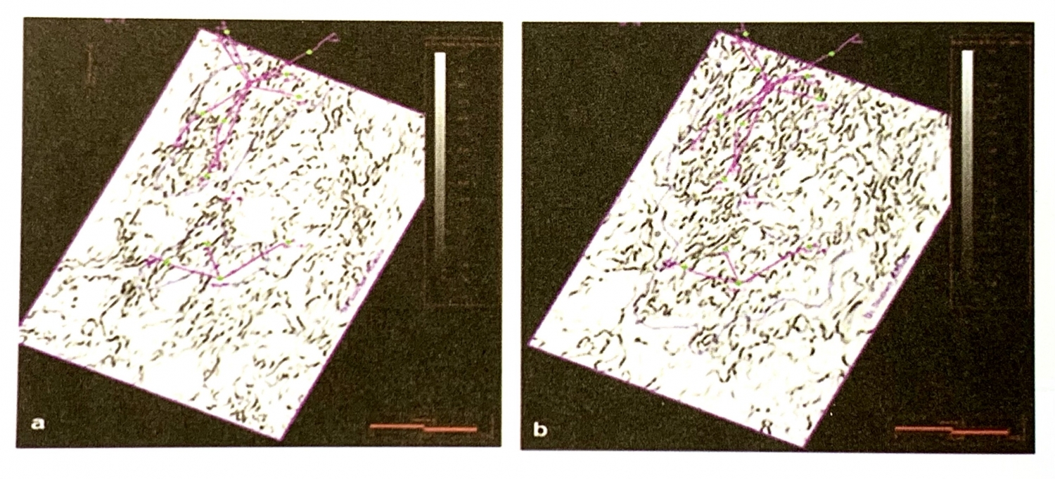 Trên hình 5.28 là thí dụ so sánh bình đồ thời gian và bản đồ thuộc tính liên kết với hình ảnh đứt gãy và đới nứt nẻ rõ hơn. Hình 5.29 là so sánh hình ảnh thuộc tính liên kết trong đá móng ở nóc móng và ở mức sâu hơn nóc móng 100ms. Hình 5.30 là các bản đồ thuộc tính biên độ và thuộc tính liên kết liên quan đến đặc điểm vỉa chứa. Các yếu tố không liên tục thể hiện các đứt gãy và đặc điểm chắn thấm đối với chất lưu.