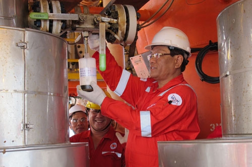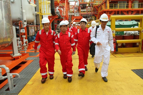 Tổng giám đốc PVN Đỗ Văn Hậu (thứ 2 từ bên trái) kiểm tra công tác trên một giàn khoan của Hoàng Long JOC