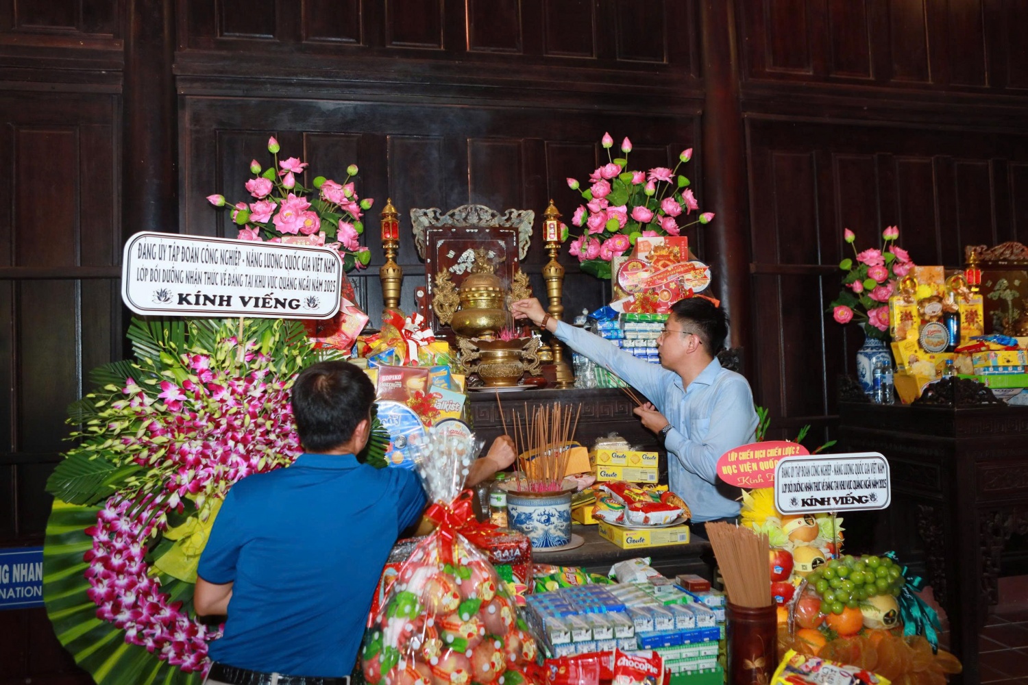 Đồng chí Lê Thế Duy, Phó Giám đốc Trung tâm Đào tạo nhân lực Dầu khí, Trường Cao đẳng Dầu khí (PV College), Trưởng đoàn (ngoài cùng bên trái) dâng hương tưởng niệm các nạn nhân trong vụ thảm sát tại Khu chứng tích Sơn Mỹ. |