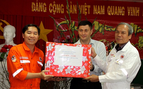 Bí thư Đảng ủy Vietsovpetro Đặng Minh Hồng (bìa phải) chúc tết người lao động trên giàn Công nghệ Trung tâm số 3, mỏ Bạch Hổ, xuân 2014. (ảnh: T. Thanh)