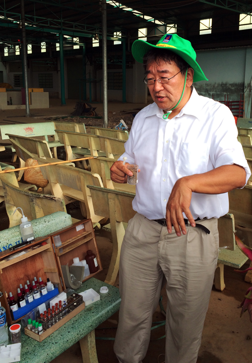 Ông Masaaki Koiwai đang tiến hành phân tích đất tại trang trại thanh long Hoàng Hậu