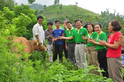 Lãnh đạo PVFCCo trao bò sinh sản cho nông dân ở xã Kim Cúc, huyện Bảo Lạc, tỉnh Cao Bằng trong một hoạt động an sinh xã hội
