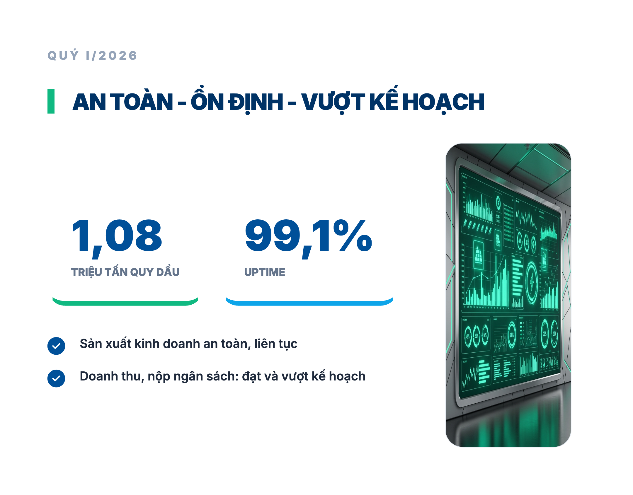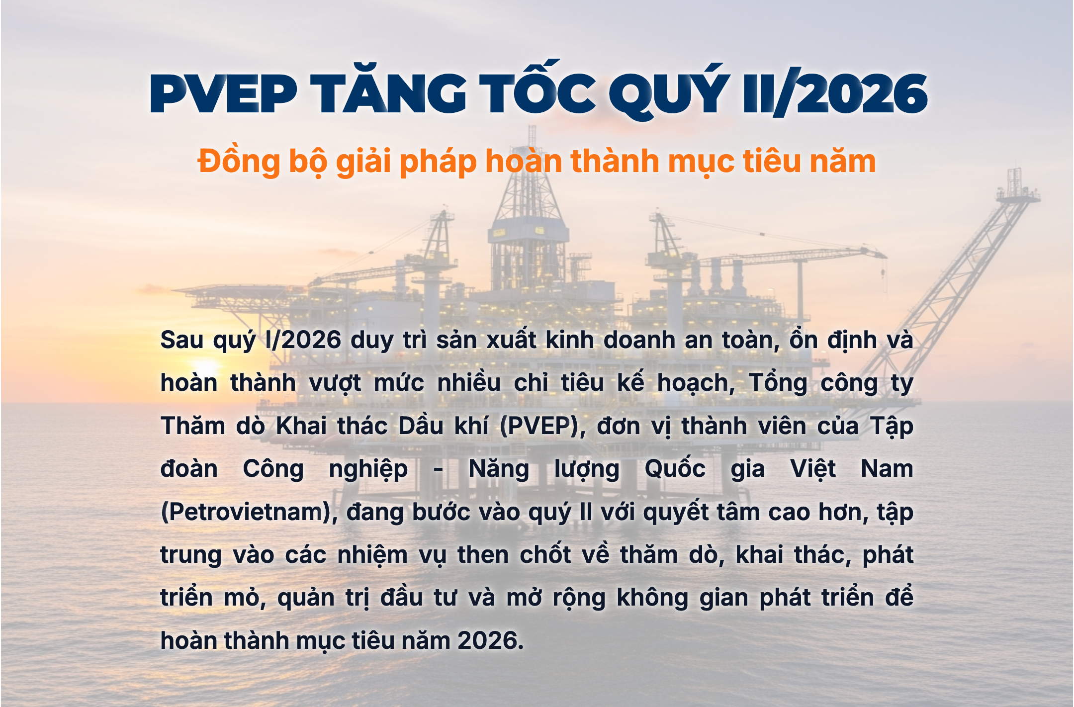 (PetroTimes) - Sau quý I/2026 duy trì sản xuất kinh doanh an toàn, ổn định và hoàn thành vượt mức nhiều chỉ tiêu kế hoạch, Tổng công ty Thăm dò Khai thác Dầu khí (PVEP), đơn vị thành viên của Tập đoàn Công nghiệp - Năng lượng Quốc gia Việt Nam (Petrovietnam), đang bước vào quý II với quyết tâm cao hơn, tập trung vào các nhiệm vụ then chốt về thăm dò, khai thác, phát triển mỏ, quản trị đầu tư và mở rộng không gian phát triển để hoàn thành mục tiêu năm 2026.