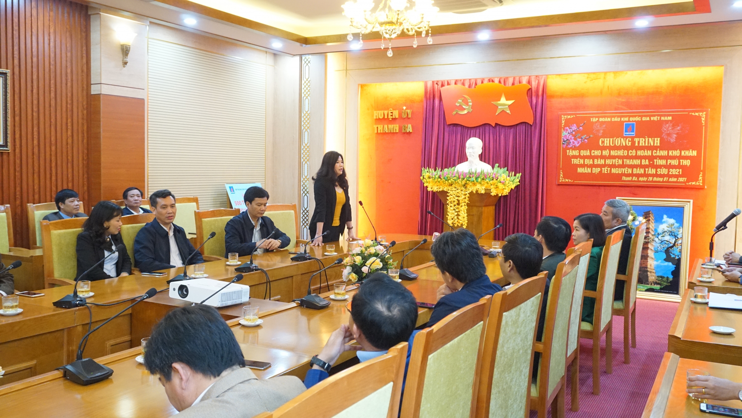 Đáp lại tình cảm của Petrovietnam, bà Nguyễn Kim Chi - Bí thư huyện Thanh Ba trân trọng cảm ơn tấm lòng của người lao động dầu khí đối với người dân huyện Thanh Ba, gửi lời chúc mừng những thành quả mà Petrovietnam đạt được trong năm 2020. Bà Nguyễn Kim Chi cũng cho biết, toàn huyện Thanh Ba có khoảng 120.000 dân, tỉ lệ hộ nghèo là khoảng 2.300 hộ, tuy nhiên có gần 300 trẻ em khuyết tật nặng, hộ cận nghèo khoảng gần 2.000 hộ. Dịp tết năm nay, nhờ tấm lòng của các nhà hảo tâm, đặc biệt là của Petrovietnam, 100% hộ nghèo và trẻ em khuyết tật sẽ đều có quà tết.