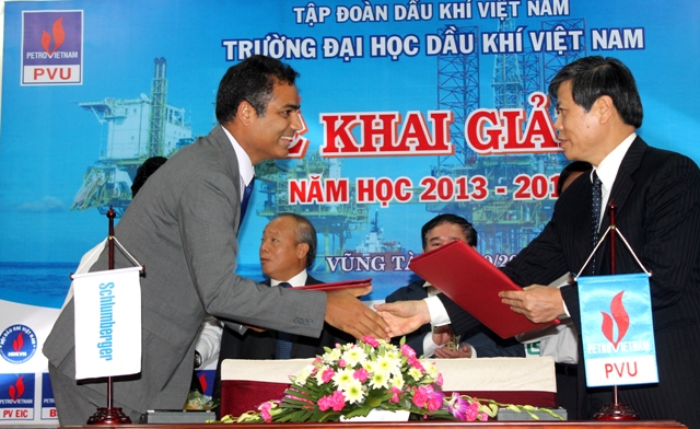Các đồng chí lãnh đạo Bộ GD-ĐT và Tập đoàn chứng kiến Lễ ký kết tài trợ giữa Công ty Schlumberger và PVU trong lễ khai giảng